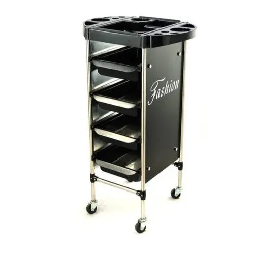 The trolley is designed in an elegant black color with a modern square-shaped base, providing a sleek and professional appearance that enhances salon interiors. Equipped with 4 high-quality wheels, it ensures smooth rolling movement across all floor surfaces. The wheels are strong and stable, offering excellent maneuverability even when the trolley is fully loaded.